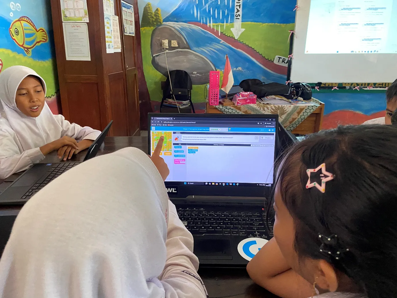 Dalam kegiatan ini, para mahasiswa memperkenalkan platform code.org, sebuah media pembelajaran interaktif yang dirancang khusus untuk anak-anak agar dapat belajar berpikir sistematis dengan cara yang menyenangkan. Melalui permainan seperti menyusun gambar, memecahkan teka-teki (puzzle), dan menyelesaikan tantangan logika, siswa diajak untuk berpikir kreatif serta melatih kemampuan analisis dan strategi.