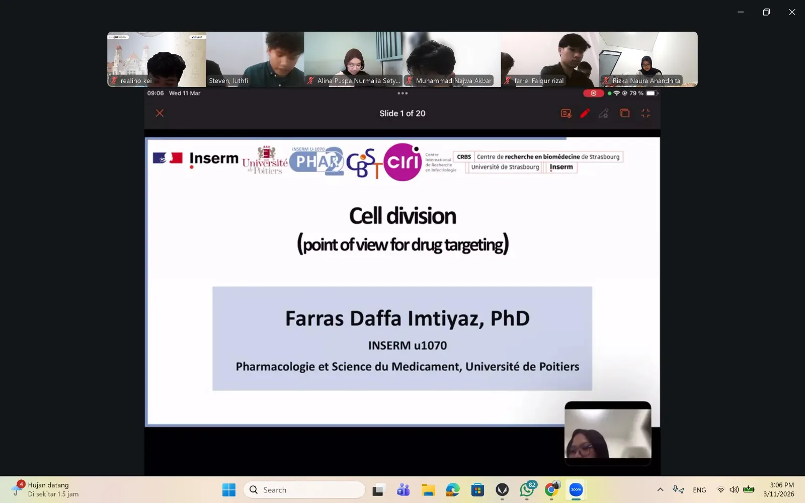 Acara UNDIP GLOBAL CLASSROOM untuk mata kuliah Biologi Sel tersebut dikoordinir oleh Ketua tim dari Prodi Bioteknologi UNDIP yaitu Prof. Dr. Hermin Pancasakti Kusumaningrum, S.Si, M.Si., serta para dosen pengampu mata kuliah tersebut. Pada kuliah pertama tanggal 04 Maret 2026 diberikan topik kuliah sesuai Rencana Pembelajaran Semester mata kuliah Biologi Sel pada Program Studi Bioteknologi Universitas Diponegoro Semarang yaitu Cell division (Point of view for drug targeting).